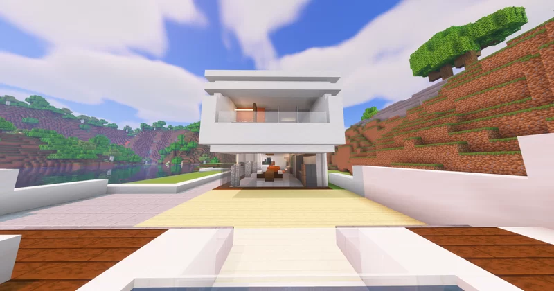A clean, contemporary modern house designed to sit perfectly beside a lake or river, blending sharp white architecture with natural terrain. This build features a sleek, layered exterior, large windows for natural light, and a spacious layout that works great as a starter-to-midgame survival base or a stylish creative build.